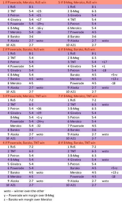Shown below for easy reference purposes only are the point differentials of the teams that are possibly going to be tied for the last semis berths up for grabs. They are different from the PBA quotient system that is actually going to be used to break ties but very similar and are usually reliable.